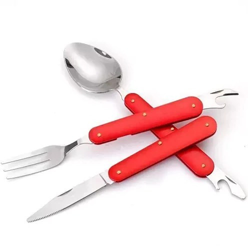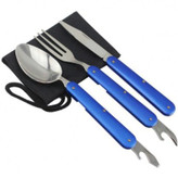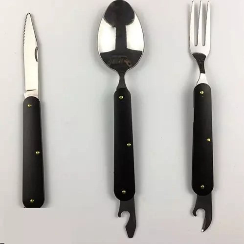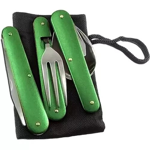 ویژگی1 عدد قاشق با درب بازکن، 1 عدد چنگال با درب بازکن، 1 عدد کارد.کیف برزنتی با امکان آویز کردن روی کوله