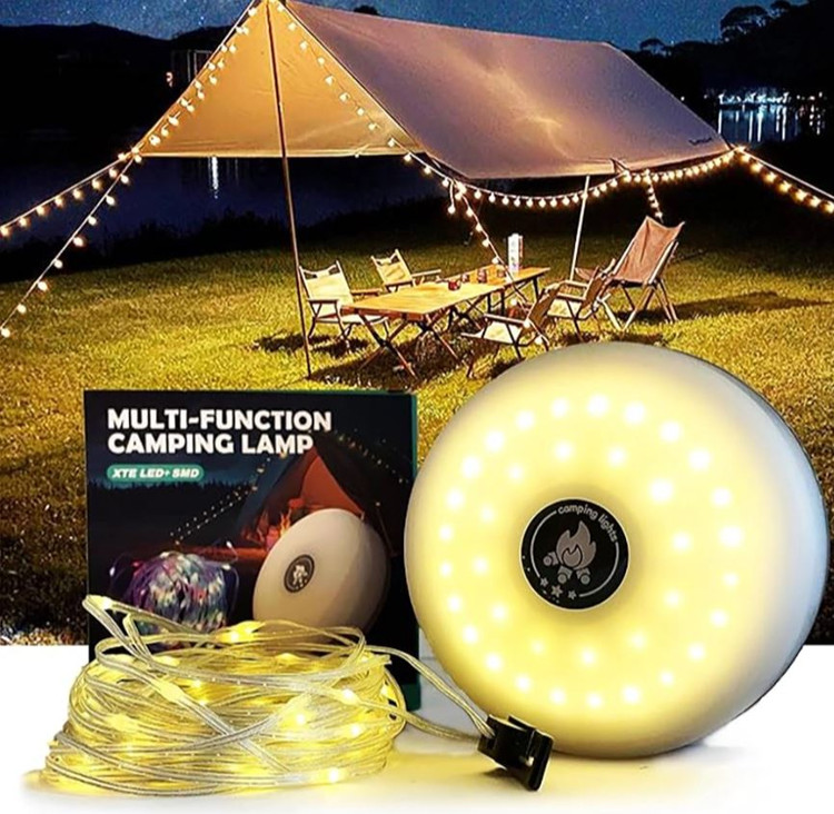 این محصول چندکاره ترکیبی از یک چراغ اصلی پرنور، ریسه LED رنگی، حالتهای متنوع نوردهی، قابلیت پاوربانک، و بدنهای مقاوم در برابر رطوبت است که در کنار هم تجربهای حرفهای و بیدردسر را فراهم میکند. چراغ اصلی آن با بهرهگیری از فناوری LEDهای قدرتمند XTE و ۳۶ عدد SMD نوری گرم، یکنواخت و چشمنواز تولید میکند. این نور بهراحتی فضای اطراف چادر، میز غذاخوری در دل طبیعت، یا محوطه مهمانی را روشن میسازد.