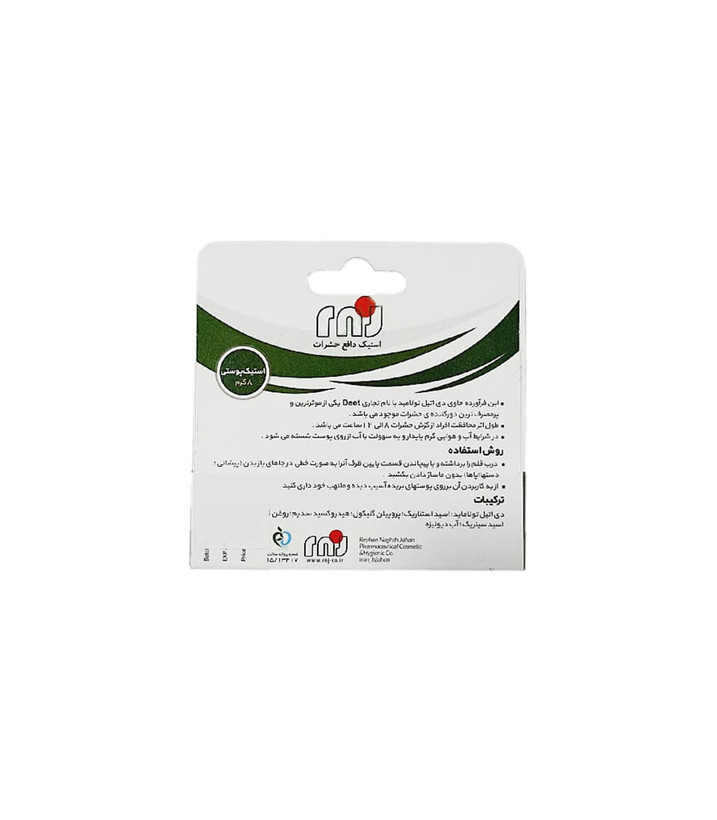استیک دافع حشرات با دارا بودن 40% دیت(موثرترین ماده دفع کننده حشرات)، تا ساعتها شما را از گزش حشرات در امان نگه میدارد و در سفر، کمپینگ، پیادهروی و هرگونه فعالیت در فضای باز، از شما در برابر حشرات محافظت میکند. به راحتی روی پوست مالیده میشود و هیچگونه احساس چربی یا چسبندگی ایجاد نمیکند. شما بعد از استفاده از مقدار کمی از این استیک روی پوست 8 تا 12 ساعت کاملاً از مزاحمت حشرات موذی مانند پشه، مگس، کک، ساس، کنه و هر نوع حشره گزنده در امان خواهید بود. این محصول بدون مواد حساسیت زا بوده و دارای مجوز از سازمان غذا و دارو است.در شرایط آب و هوایی گرم پایدار و به سهولت با آب بر روی پوست شسته می شود.