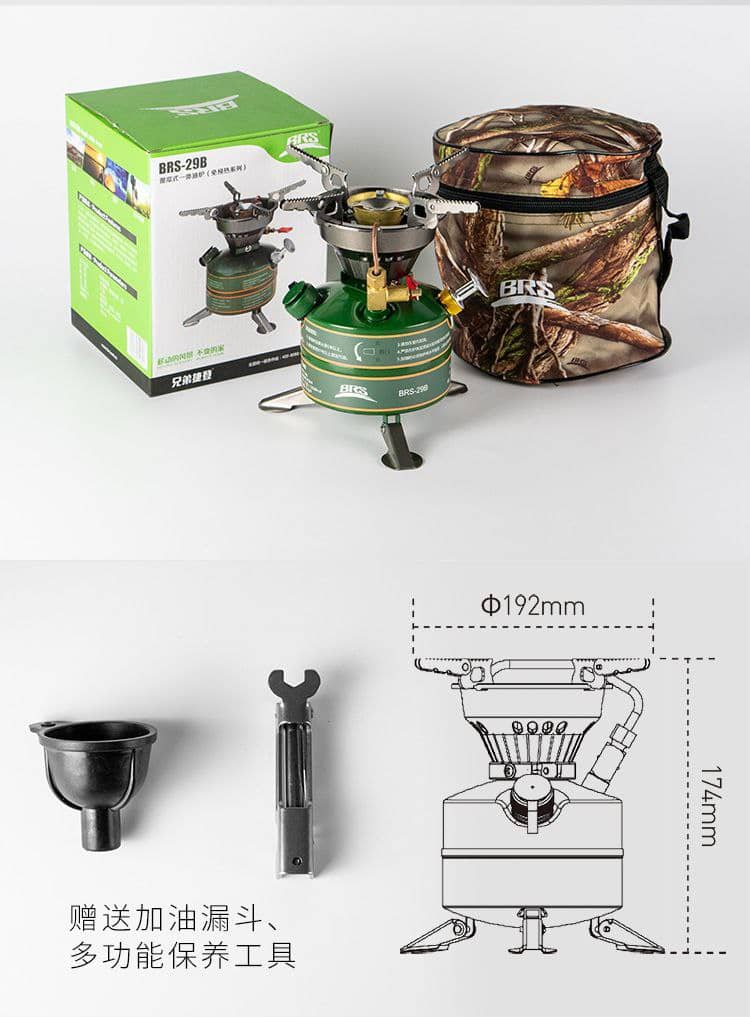اجاق BRS-29B با وزن 610 گرم و ابعاد باز شده 17.4×19.2 سانتیمتر، به شما امکان حمل آسان و راحت را میدهد، در حالی که کیس مقاوم و هاردکیس همراه آن با ابعاد 17.5×13.5×18.4 سانتیمتر برای محافظت از اجاق در برابر ضربات طراحی شده است. این اجاق از فولاد ضد زنگ، آلیاژ آلومینیوم و مس ساخته شده است که آن را بسیار مقاوم و با دوام در برابر شرایط محیطی میکند.
