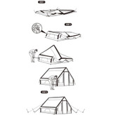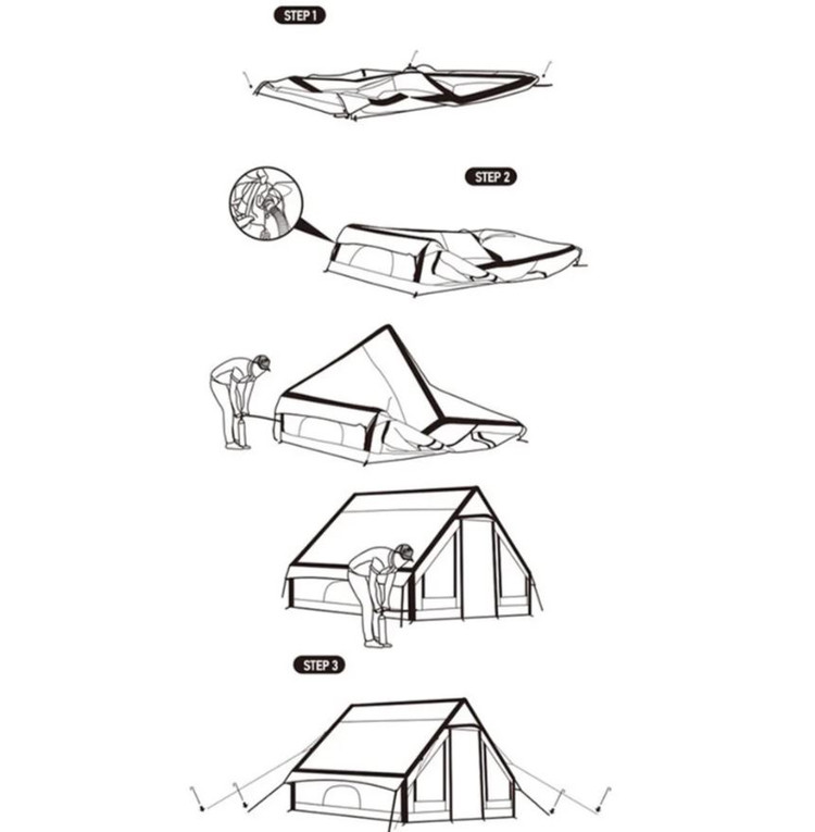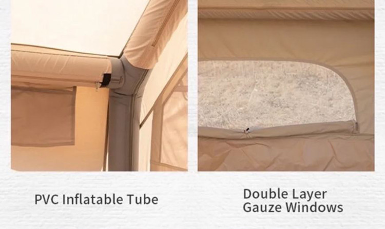 چادر همراه با پمپ باد، طناب بادگیر، میخ فولادی و کیف ذخیرهسازی عرضه میشود. این وسایل به نصب سریع و محکم چادر کمک میکنند و باعث میشوند استفاده از آن در فضای باز ساده و راحت باشد. نصب چادر بدون نیاز به سازههای پیچیده انجام میشود.